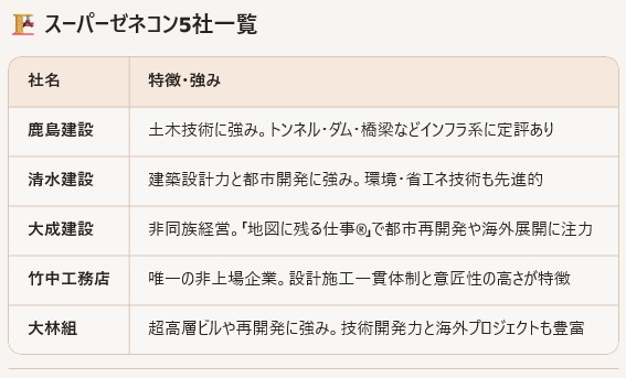 ちなみに国内におけるスーパーゼネコンは下記の通りです。